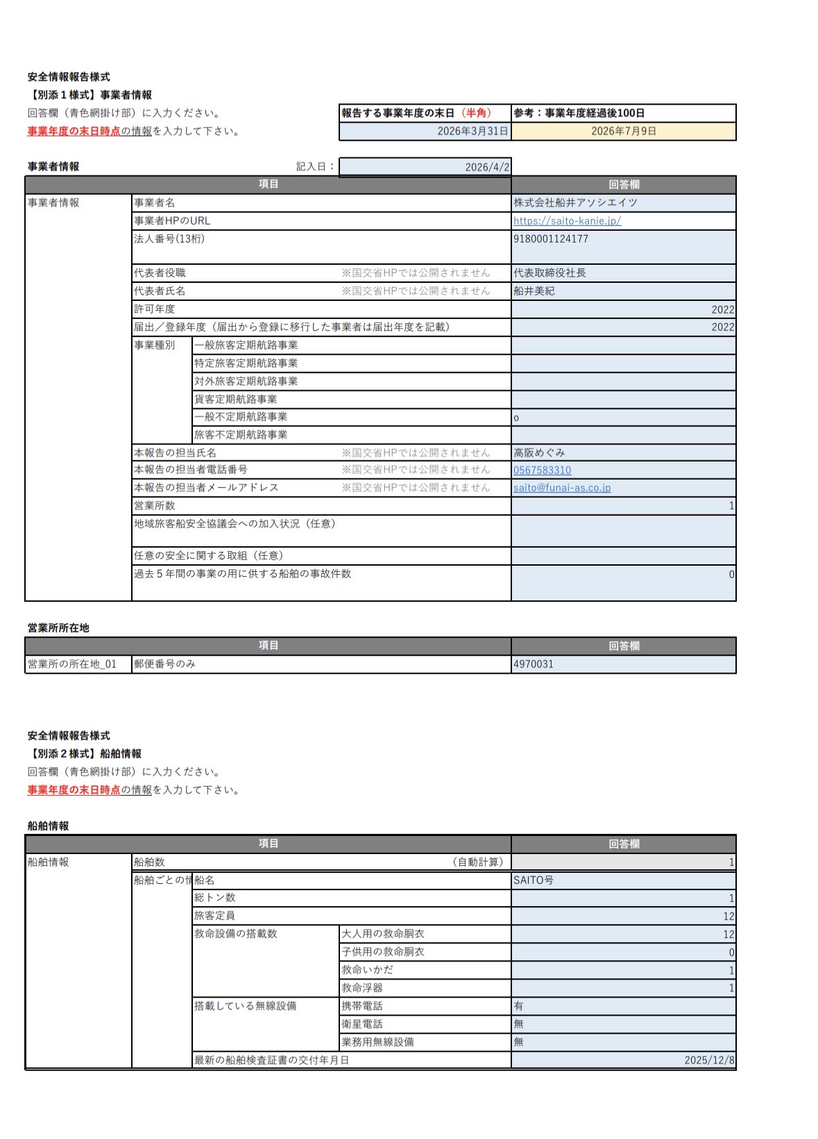 海上運送法施行規則の改正に伴い、当該事業に係る安全情報を公表しております。