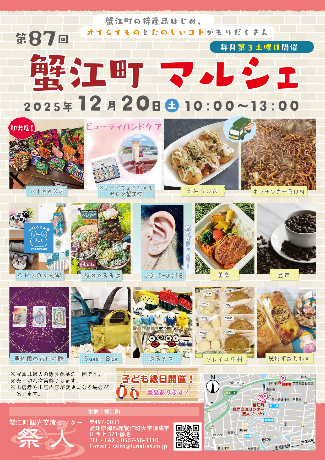 ORSOくん家(ハンドメイド雑貨、刺しゅう小物)、初出店klee03(アフリカン雑貨)、子供縁日、Sugar Bag(ハンドメイドバック)、JOLI-JOIE(耳つぼジュエリー、ハンドメイド雑貨)、多肉のるるは(多肉植物、リメイク鉢)、はるきち(あみもの雑貨)、美佐樹の占いの館(タロット占い)、メナードフェイシャルサロン蟹江桜(ハンドケアなど)