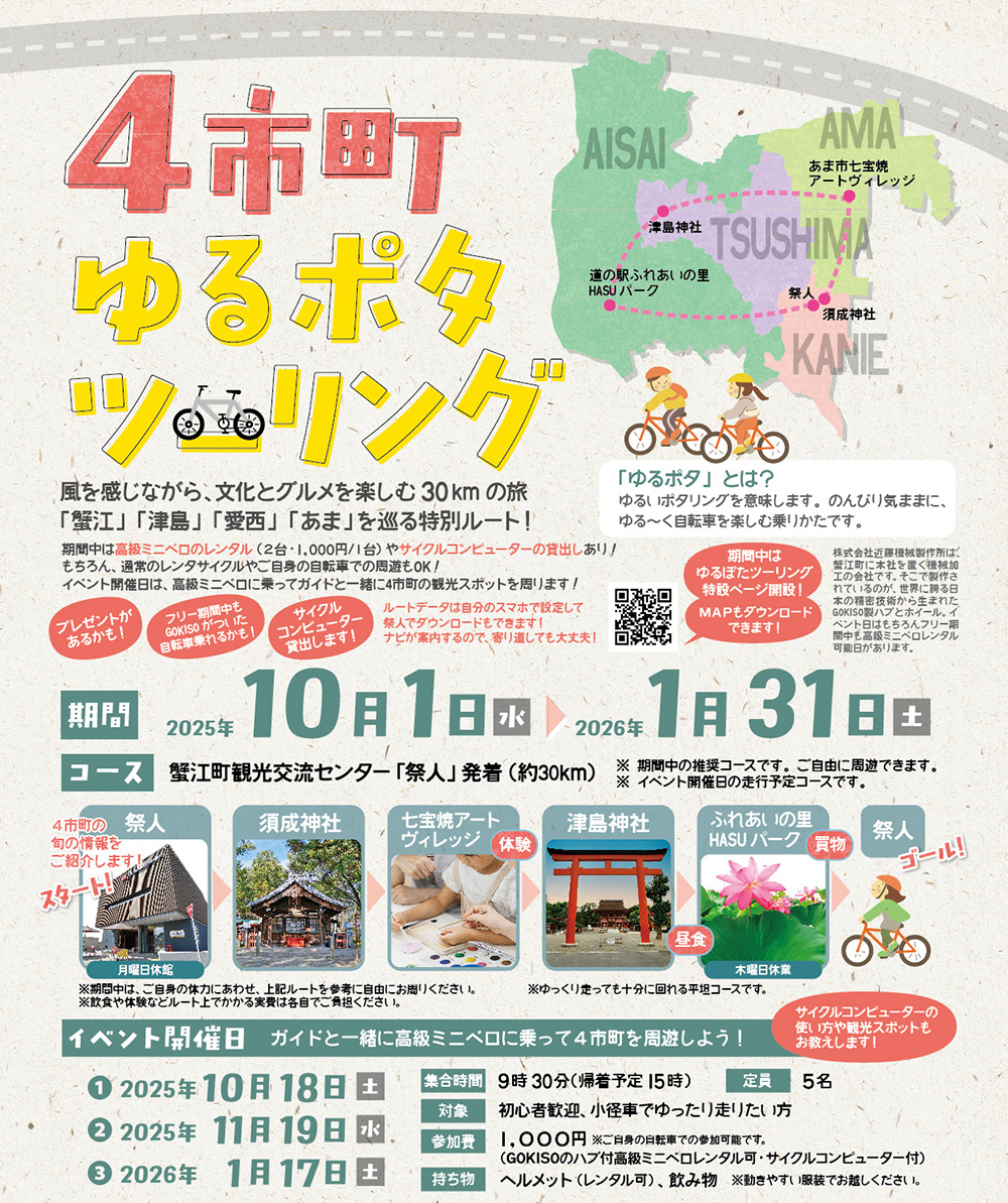 昨年度開催した、蟹江町・津島市・愛西市・あま市の4市町を巡る高級ミニベロゆるぽたツーリングイベント。30kmという距離も「まだ走れる!」と大好評だったこちらのコース。ルートデータは引き続き公開してます♪ダウンロードできますので、ぜひお持ちのサイクルコンピュータに入れて、コースを巡ってみてください!